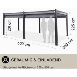 Das Pavillon-Komplettset enthält alles, um ein Areal von 3 x 6 Metern mit wenig Aufwand in einen sommerlichen Schattenplatz zu verwandeln. Das Gerüst aus 10 x 10 cm Pfosten mit 1 mm Materialstärke ist nicht nur äußerst stabil: Dank der Fertigung aus pulverbeschichtetem Aluminium ist es auch sehr leicht. Perfekt für die langfristige Erholung im Freien – ohne Rostbildung.