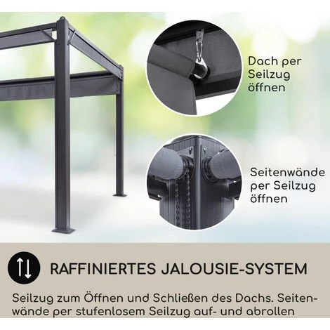 Mit dem stufenlos raffbaren Stoffdach aus 180 g/m² Polyester erhält man die volle Kontrolle über Schatten und Sonne. Der Seilzug lässt das Sonnendach des Pavillons in seinen Führungsschienen geschmeidig vor- und zurückgleiten, die wasserabweisende Beschichtung schützt vor Schimmel und kurzen Regenschauern. Durch die flexibel auf- und abrollbaren Seitenteile aus 160 g/m² Polyester-Stoff bleibt man die ganze Zeit windgeschützt.