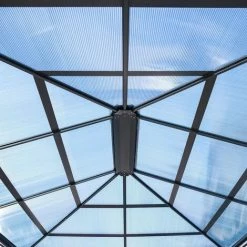 - Pfosten sowie Rahmen- und Dachkonstruktion aus 100% pulverbeschichtetem Aluminium, Schrauben aus rostfreiem Edelstahl.