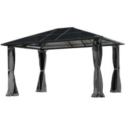 - Pfosten, Rahmen- und Dachkonstruktion sind aus anthrazit-pulverbeschichtetem, rostresistentem und witterungsbeständigem 100% Aluminium.