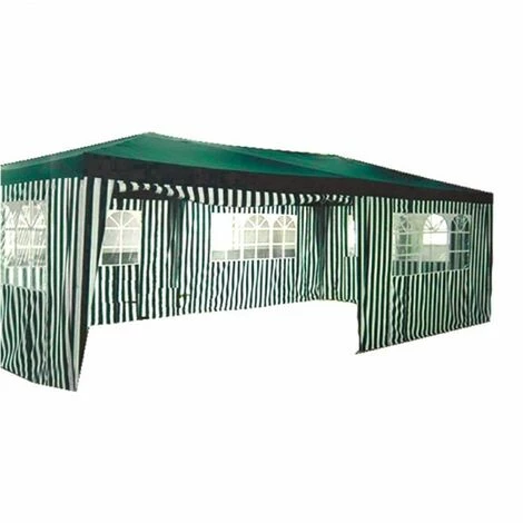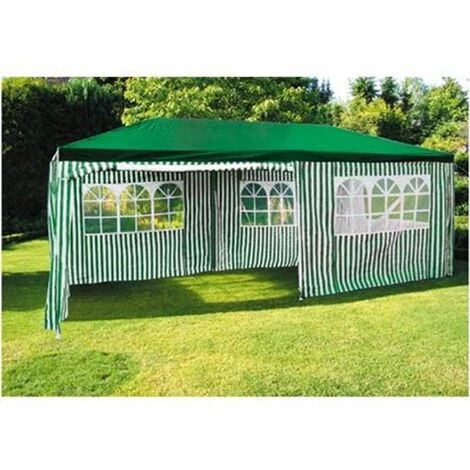 Großer Party Pavillon mit den Maßen 6 x 3m inklusive 6 Seitenteilen. Der Pavillon besteht aus einem stabilem Metallrohrrahmen, der sich durch sein Stecksystem schnell und unkompliziert zusammenbauen lässt. Für zusätzliche Stabilität und Standfestigkeit kann er mit Hilfe von Heringen im Boden verankert werden. Die 6 enthaltenen Seitenteile schützen den Innenraum vor äußeren Einflüssen wie Wind und kurzen Regenschauern.