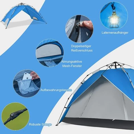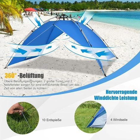 Unser Campingzelt eignet sich für bis zu 4 Personen, sodass Sie sich mit Familie und Freunden am Strand, beim Picknicken und Angeln. Es besteht aus hochwertigem Polyester mit Silberbeschichtung, wodurch es besonders beständig gegen Regen und Sonne ist. Je nach Bedarf kann auch einfach nur die Abdeckung verwendet werden. Das Zelt stellt sich schnell von alleine auf und eine praktische Tragetasche wird mitgeliefert. Es besteht aus atmungsaktivem Stoff und auch die Fenster und Türen tragen zur Luftzirkulation bei.