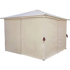 Das Dach wird mit Klettverschlüssen am Gestell befestigt. Durch die PVC-Beschichtung ist dieser Pavillon auch bei Regen nutzbar und bietet Personen und Gartenmöbeln Schutz vor Wasser. Die Seitenteile sind jeweils in der Mitte zu öffenen und können dann komplett an die Ecken geschoben werden. Es sind insgesamt vier Seitenteile im Lieferumfang enthalten, der Pavillon kann damit komplett verschlossen werden. Je nach Bedürfnis können einzelne Felder oder auch der komplette Pavillon geöffnet werden.