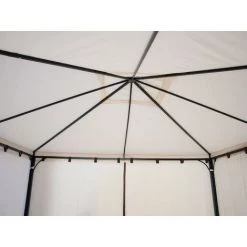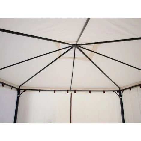 Eleganter Pavillon VENEZIA in stabiler Ausführung. Dachbespannung aus wasserdichtem PVC-beschichtetem Polyester (250g/m²), ecru. Farblich passende Seitenteile aus Polyesterstoff, ecru.