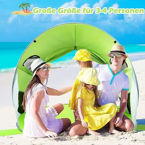 Die Pop up Design Strandmuschel braucht keine Montage, sekundenschnell aufklappen und zusammenfalten. 1,3 kg Nettogewicht und der Geschenktragetasche macht sie tragbar. Das wasserdichte silberbeschichtete Polyestertuch bietet UV 50+ Schutz, Anti-Verschleiß und Wärmeisolierung. Blockieren Sie das schädliche Sonnenlicht der Sonne für eine bessere Entspannung. Mit 5,5 mm Glasfaserstange, 4 Sandsäcke, 8 Metallheringe und 4 lange Seile ist die Strandmuschel stabiler. Man kann nach Bedarf ganz oder teilweise die 2 große Türen und 2 Gitterfenster öffnen. Dadurch gibt es so angenehmen Luftaustausch. Die Größe der Strandmuschel für 3-4 Personen ist einen idealen schattigen Rückzugsort zum Stillen, Mittagsschlaf für Kinder, umziehen und chillen für Groß und Klein.