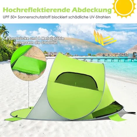- Automatisches Pop Up Design und Portabilität: keine Montage erforderlich, mit Pop Up Design in sekundenschnell aufklappen und auch einfach zusammenfalten. Das Nettogewicht der Strandmuschel beträgt nur 1,3 kg. Mit Tragetasche macht sie tragbar.