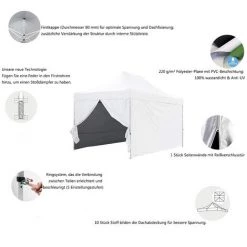 Klappzelt 3×4,5 m, 32 mm Rohr aus PREMIUM STAHL und 420D Polyestergewebe mit Silberfolie, ideal für Einzelpersonen und Profis, auch für Veranstaltungen im Außen- und Innenbereich. Bestehend aus seiner Struktur, einer Dacheindeckung und seinem 4-Wand-Pack. AUSGEZEICHNETES QUALITÄTSPREISVERHÄLTNIS Montage / Demontage ohne Werkzeug mit einfachem Transport!