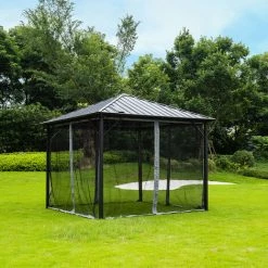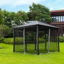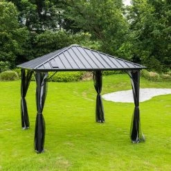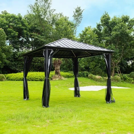 Der Pavillon Azur bietet Ihnen mit seinem Dach aus Metall einen zuverlässigen Schutz vor Sonne, Regen und Insekten. Die Seitenteile bestehen aus strapazierfähigem Polyester und können bei Bedarf geschlossen werden. Für hohe Standfestigkeit und Witterungsbeständigkeit sorgt das Gestell aus pulverbeschichtetem Stahl. Mit dem Insektenschutz werden Sie zuverlässig vor Insekten geschützt. Dank der besonders hochwertigen Verarbeitung und seiner hohen Qualität wird dieser Pavillon zu einem echten Hingucker. Mit den Maßen von ca. 270 cm x 270 cm bietet der Pavillon ein trockenes und schattiges Plätzchen.