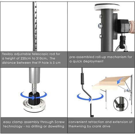 - 【VERSTELLBARE HÖHE】Dank 21 Löcher auf dem Rohr und einstellbaren Füßen lässt sich die Höhe der Balkonmarkise variabel zwischen 2.25 und 2.75 m bestimmen.