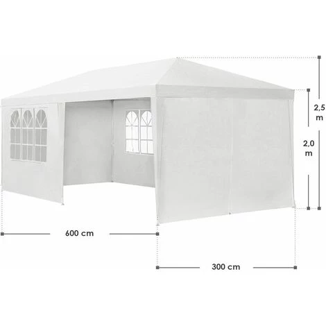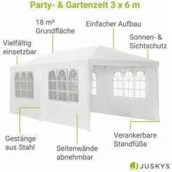 Mit seiner 3 × 6 m großen Grundfläche ist das Partyzelt auf einer Gesamtfläche von 18 m² ein großzügiger Schattenspender in Ihrem Garten. Es bietet ausreichend Platz für Stehtische, Esstischgruppen und Bierzeltgarnituren. Hinweis: Nutzen Sie den Gartenpavillon bitte nur bei trockenem Wetter.