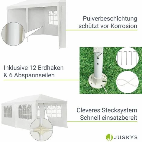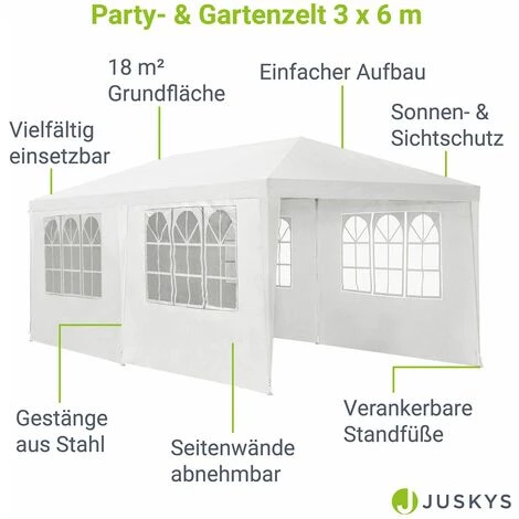 Das 3×6 m große Partyzelt (Weiß) ist der perfekte Sonnenschutz für Outdoor-Veranstaltungen jeglicher Art. Ob Grillabend, Geburtstag oder Hochzeit – der praktische Pavillon lädt zum gemütlichen Zusammensitzen und Feiern mit Familie und Freunden ein. Unter dem Festzelt sitzen Sie und Ihre Gäste vor der prallen Sonne gut geschützt. Am Abend dienen die abnehmbaren Seitenteile als zusätzlicher Schutz vor kühlen Luftzügen und Stechmücken. Optimale Voraussetzungen, um besondere Anlässe ausgiebig im eigenen Garten oder auf der Terrasse zu feiern.