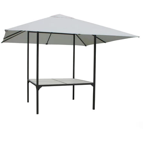 Die Überdachung ist mit einem Dachtextil aus Polyester in lichtgrau bespannt und mit einer wasserabweisenden Beschichtung versehen. So sind Sie vor leichten Regenschauern geschützt und Ihr Gartentisch bleibt stets trocken.