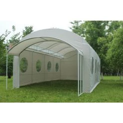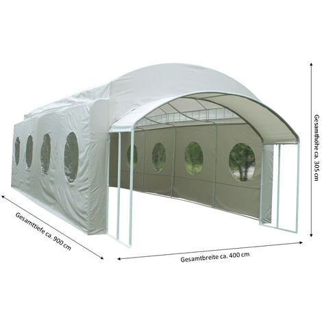 Die großzügigen runden Fensterflächen, sowie die Lichtbänder im Dach sorgen für viel Licht im Innenraum und verleihen dem Zelt eine moderne Optik. Die Dach- und Seitenbespannung ist aus 100% Polyester mit einer wasserabweisenden Beschichtung gefertigt. Zudem ist das Material besonders pflegeleicht und die Bespannung kann einfach gereinigt werden.