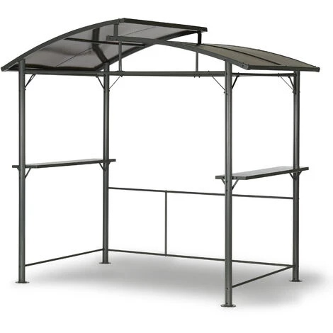 Die Konstruktion kombiniert rostfreies Aluminium mit stabilem, pulverbeschichtetem Stahl und einem wetterfesten Dach aus wasserundurchlässigen Polycarbonatplatten. Rauch und Hitze können konstruktionsbedingt gut abziehen.