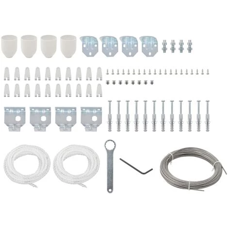 Dieses Zubehörset ist für alle Markisen mit einer Länge von 270 cm geeignet. Im Lieferumfang sind 1 Stahlkabel, 2 Zugschnüre, 4 Eckwinkelsets, 20 Haken sowie andere Montagezubehörteile wie Schrauben, Bolzen, Muttern, usw. enthalten.