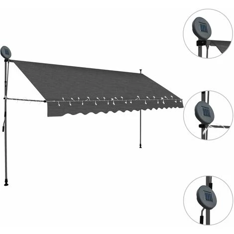Diese manuell einziehbare Markise ist der ideale Schattenspender, entweder vor einem Fenster, auf der Terrasse, dem Balkon oder in Ihrem Garten. Diese wasser- und schmutzabweisende sowie UV- und wetterbeständige Markise besteht aus hochwertigem Polyester mit PU-Beschichtung. Der starke Stahlrahmen macht die Markise robust und langlebig. Das leicht zu reinigende Polyesterverdeck kann entfernt und gewaschen werden. Dank der Griffkurbel ist diese Markise einziehbar. Die Höhe und der Winkel der Markise können ebenfalls eingestellt werden. Darüber hinaus sorgen die solarbetriebenen LED-Leuchten nachts für energiesparende Beleuchtung. Die Markise ist leicht zu montieren. Diese Markise ist die perfekte Wahl für Ihren Außenbereich; sie lässt sich einfach von Hand bedienen.