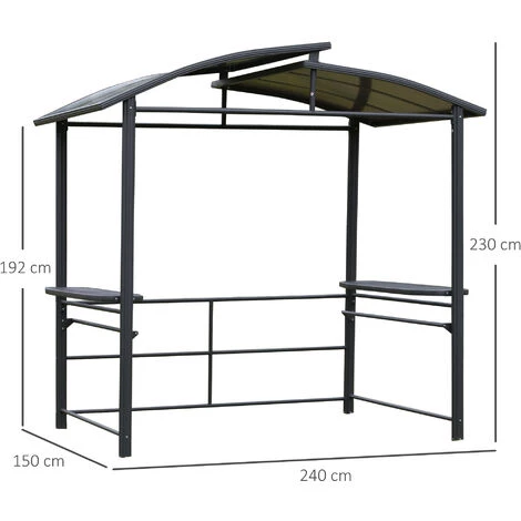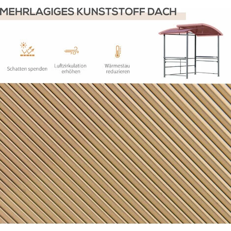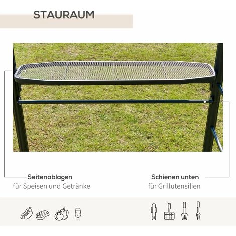 Wenn Sie an einem Wochenende mit Ihren Freunden grillen wollen, machen Sie sich Sorgen über den regnerischen Tag oder starke UV-Strahlen? Mit unserem BBQ-Zelt von Outsunny können Sie jederzeit grillen, wann immer Sie wollen. Das Dach des BBQ-Zeltes ist UV-geschützt und regenfest. Seitenregale und die hängenden Stangen bieten Platz für Getränke, Essen und Grillzubehör.