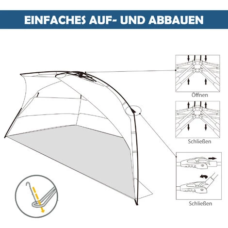 Sind Sie bereit für den nächsten Strandurlaub? Mit unserem Pop-up Strandzelt von Outsunny sind Sie bestens bedient. Das praktische Design lässt sich in Sekundenschnelle aufbauen und bietet Platz für bis zu 2 Personen. Der erweiterbare Boden bietet darüber hinaus Platz für Picknicks oder Sonnenbaden. Verstärkt mit Sandsäcken um das Zelt vor Wind zu schützen, sowie 4 Heringen for noch mehr Stabilität, steht Ihrem nächsten Urlaub nichts mehr im Wege!