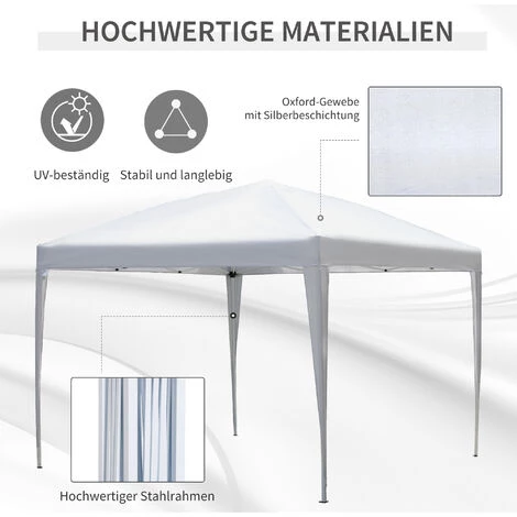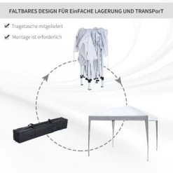 Dieser 3 x 3 m Faltpavillon ist ein großartiger, praktischer Unterstand im Freien, der Ihre Familie oder Gäste vor unangenehmem Wetter schützen wird. Er ist ideal für Familienfeiern, Hochzeiten, Picknicks, Sportveranstaltungen, Verkaufsstände, Handwerksmessen, Baustellen und Campingausflüge. Dieser Pavillon lässt sich in weniger als einer Minute auf- und abbauen und wird außerdem mit einer passenden Tragetasche geliefert, um den Transport noch bequemer und einfacher zu gestalten.