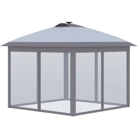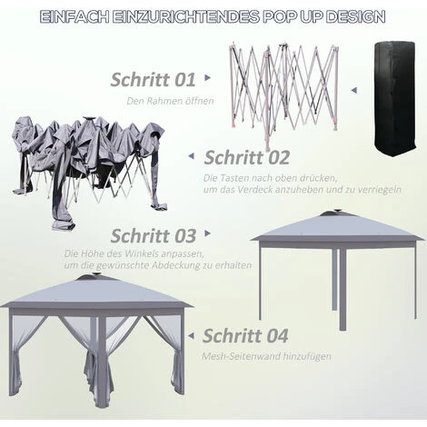 Der Outsunny Pavillon ist ideal für Outdoor-Partys, Versammlungen und Camping-Reisen. Der Falt-Pavillon besteht aus einem pulverbeschichteten Stahlrahmen und Oxford-Gewebe, er schützt Sie vor direkter Sonneneinstrahlung und Wind. Dieser tragbare Pavillon verfügt über solarbetriebene LED-Leuchten, mit denen Sie das Leben im Freien Tag und Nacht genießen können. Die abnehmbaren Mesh-Seitenwände des Pavillons sorgen für eine gute Belüftung und halten gleichzeitig Insekten fern.