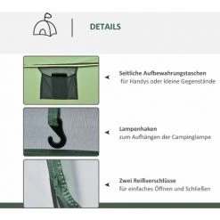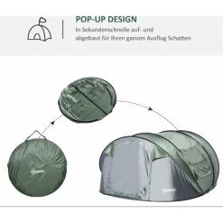 Unser Campingzelt von Outsunny ist die perfekte Ausrüstung für Camping Trips, Übernachtungen und vieles mehr. Es bietet genug Platz für 4-5 Personen, ist also ideal für den nächsten Familienurlaub. Das Pop-Up System macht den Aufbau kinderleicht. Die zwei großen Türen bietet einfachen Zugang zum inneren und die 4 verschließbaren Fenster bieten gute Luftzirkulation. Eine Tragetasche ist für den einfachen Transport im Lieferumfang enthalten!