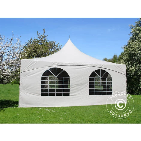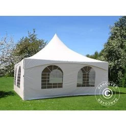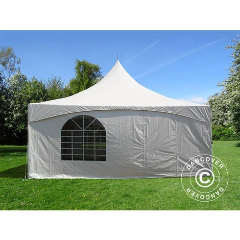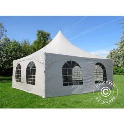 Elegantes und exklusives Partyzelt für Ihre Sommerparty oder eine andere Art von Veranstaltung, bei der Sie auf eine schöne und funktionale Umgebung für den Anlass Wert legen. Die Dachplane mit ihrer charakteristischen Spitzenform verleiht dem Partyzelt ein einzigartiges und elegantes Aussehen und Gefühl. Die Fenster im georgianischen Stil sorgen für einen schönen Lichteinfall und eine fantastische Aussicht. Sie können das Partyzelt mit allen vier Seitenwänden nutzen, um einen geschlossenen Bereich zu haben, aber Sie können auch nur eine oder mehr Seitenwände verwenden, um eine flexiblere Lösung zu ermöglichen. Sie können das Partyzelt sogar als Pavillon nur mit der eleganten Dachplane nutzen, wenn es das Wetter erlaubt.