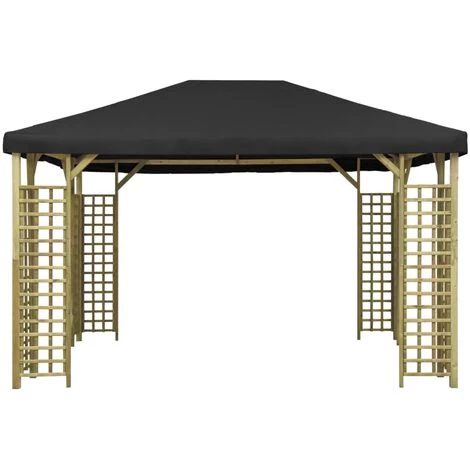 Aus 100% Polyester mit PVC-Beschichtung gefertigt, schützt das Dach vor starken, schädlichen UV-Strahlen und direkter Sonneneinstrahlung. Es ist auch wasserbeständig und staubgeschützt. Die Überdachung verfügt über eine solide und schwere Kiefernholz-Konstruktion mit dekorativen quadratischen Details, was sie sowohl stabil als auch schön macht. Dieser Rahmen zeichnet sich durch hohe Festigkeit, Härte, Form- und Fäulnisbeständigkeit aus. Darüber hinaus ist dieser Artikel einfach zu montieren.