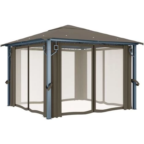 Das Dach aus Oxford-Stoff mit PA-Lackierung schützt Sie vor blendendes Licht und schädlichen UV-Strahlen. Der Pavillon besitzt eine solide Konstruktion aus starkem Aluminium und Stahl und ist dadurch rostbeständig und sehr stabil. Zudem wird der Pavillon mit 4 Seitenteilen geliefert, die bei schlechtem Wetter nach unten gezogen werden können. Netzfenster sind ebenfalls dabei, um Insekten fernzuhalten und gleichzeitig eine gute Luftzirkulation zu gewährleisten. Die mitgelieferten Klettverschlüsse sorgen für eine einfache Befestigung. Darüber hinaus schafft die Lichterkette eine gemütliche Atmosphäre im Garten bei Sonnenuntergang. Die Leuchten sind umweltfreundlich, da sie tagsüber durch Sonnenenergie aufgeladen werden.