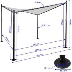 Dank der Schräge kann das Regenwasser sich nicht auf dem Dach ansammeln und zu unerwünschten Sturzfluten führen. Somit ist die Pergola noch besser auf Regenschauer vorbereitet. Grundsätzlich empfehlen wir, das Dach vor größeren Regenschauern abzubauen. Ebenso müssen wir darauf hinweisen, dass bei Schnee der Bezug demontiert werden muss, da die Dachstreben für diese Last nicht ausgelegt sind. Die Pergola wird mit Schrauben montiert. Diese sind aus Stahl und können – da es sich um Schrauben handelt – nicht pulverbeschichtet werden. Daher werden diese unter normaler Witterung mit der Zeit rosten. Dieser Rost wird jedoch meist erst bei der Demontage des Daches sichtbar. Sofern das stört kann der Rost mit handelsüblichen Rostentferner von Ihnen leicht entfernt werden.