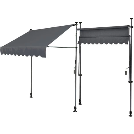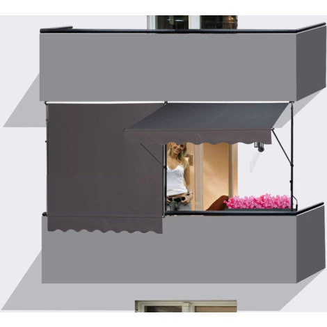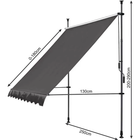 Einfache Montage zur Befestigung zwischen Boden und Decke ohne Bohren. Höhenverstellbar für Deckenhöhen von 200-290cm Besonders geeignet für Balkone, Mietwohnungen, Mauervorsprünge sowie Terrassen, bei denen keine Festmontage durch Bohrungen erfolgen soll. Leichtes Ein- und Ausfahren durch Kurbelantrieb per Handkurbel. Hochwertiger Markisenstoff aus 280g Tuchware.