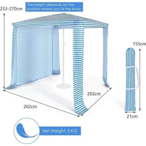 Dieser tragbare Sonnenschirm ist Ihr Lebensfreunde! Die Fläche von 202 × 202 cm und die Sonnenschutzbeschichtung können Ihrer ganzen Familie Schatten spenden, und die Seitenwand mit Reißverschluss ist auch bequem für Sie zu demontieren oder zu installieren, je nach Bedarf. An der Schirmsäule befindet sich auch ein Höhenverstellknopf, den Sie frei zwischen 233-270 cm einstellen können. Dank hochwertiger Materialien hat der Sonnenschirm eine sehr starke Konstruktion. Vier Ecktaschen können auch als Sandsäcke verwendet werden, um den Schirm stabiler zu machen. Eine Tragetasche ist ebenfalls enthalten, sodass Sie sie platzsparend verstauen können, wenn sie nicht verwendet wird oder sie zum Camping und Picknick mitnehmen können, wodurch Sie Zeit und Sorgen sparen. Zögern Sie nicht!