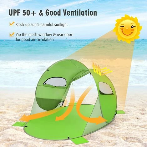 - Praktische Seitentaschen und Fenster: Das Sonnenzelt hat zwei Fenster und eine Tür mit Reißverschlüssen, sodass Sie die leicht öffnen und schließen können. Damit erhalten Sie eine breite Sicht. In den Taschen auf beiden Seiten können Servietten, Handtücher, Spielzeug usw. aufbewahrt werden.
