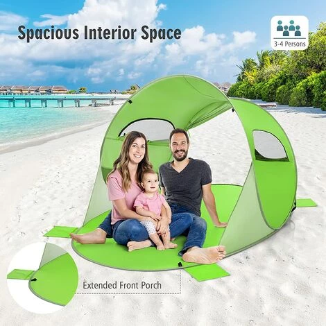 Suchen Sie ein tragbares Strandzelt? Schauen Sie sich unsere Produkte an. Unser Strandzelt kann in kurzer Zeit entfaltet werden. Zubehör wie 4 Sandsäcke, 4 Seile und 8 Bodennägel kann verhindern, dass das Strandzelt vom Wind weggeblasen wird. Die Fenster auf beiden Seiten und die Hintertür haben Reißverschlüsse, sodass Sie sie leicht öffnen und schließen können. In den Seitentaschen auf beiden Seiten können kleine Gegenstände aufbewahrt werden. Nach Gebrauch können Sie das Strandzelt falten und in die mitgelieferte Tragetasche legen. Das Strandzelt ist ein guter Sonnnschutz für den Außenbereich.