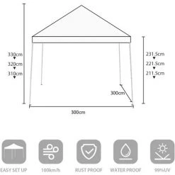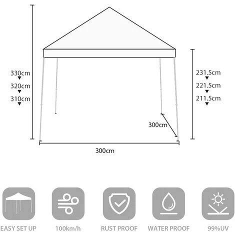 - Größe: 3x3m Faltpavillon. Sie können die Höhe mithilfe des Tasten einstellen. Es stehen 3 Höhen zur Auswahl: 310cm, 320cm und 330cm.
